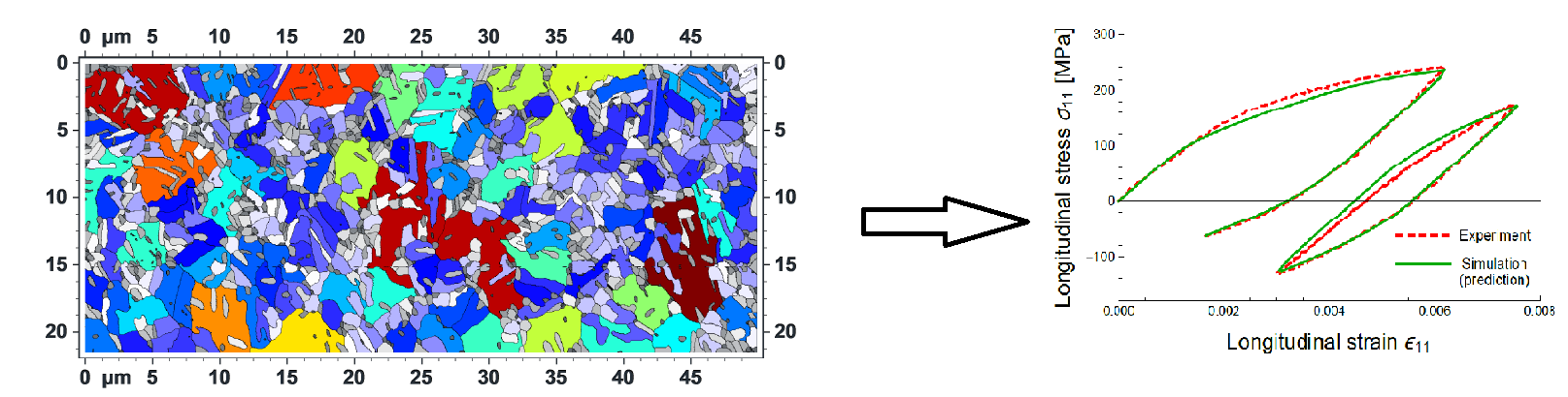 We have developed a micro-mechanical model for elastic-viscoplastic material (here for copper) based on microstructure characterization (texture, grain orientation, grain size, etc.). Microstructural information were obtained using dedicated characterization devices at LEM3 laboratory (SEM, EBSD, X-ray diffraction, etc.). From this information, the cyclic response of copper was reproduced with good accuracy. This work is the result of a collaboration with researchers (K. Kowalczyk-Gajewska and K. Frydrych from IPPT Warsaw, Poland). An article was recently submitted [3].