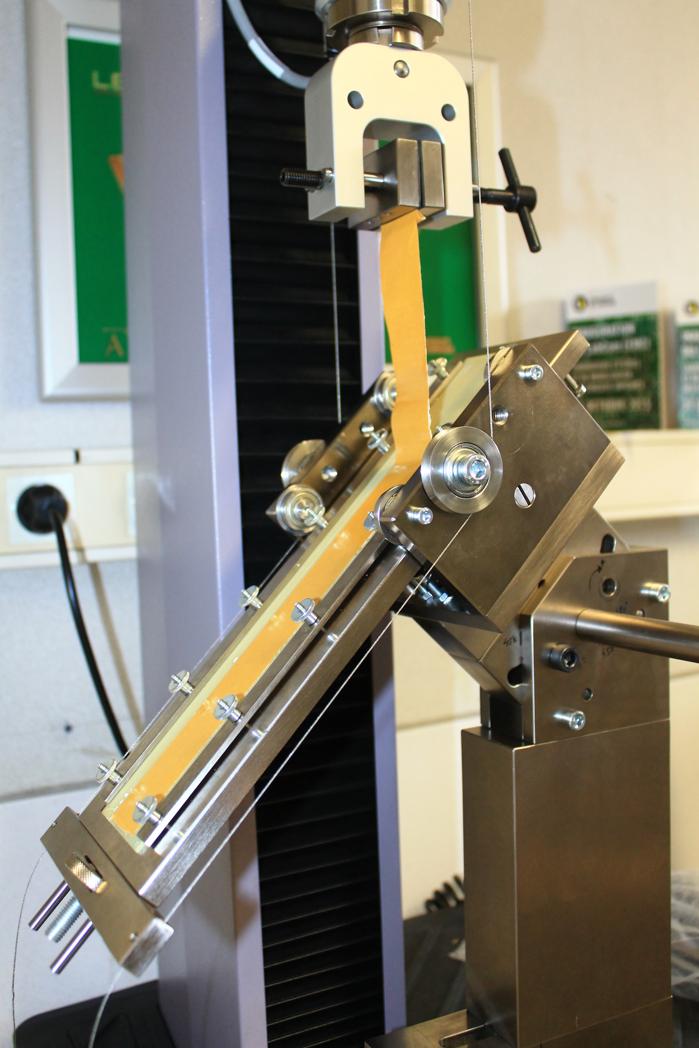 Dedicated tensile device with a peel test. Note that the peel angle can be modified