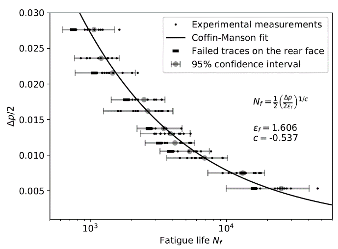 | Number of cycles to failre versus plastic strain amplitude. The results enable to identify the Coffin-Manson fatigue law. |